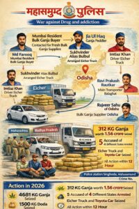 जानकारी के मुताबिक, पुलिस को मुखबिर से सूचना मिली थी कि ओडिशा से एक ट्रक के जरिए भारी मात्रा में गांजा महाराष्ट्र ले जाया जा रहा है। सूचना मिलते ही महासमुंद पुलिस और एंटी नारकोटिक टास्क फोर्स ने तत्काल कार्रवाई करते हुए नेशनल हाईवे-53 पर सिंघोड़ा थाना क्षेत्र के रेहटीखोल के पास नाकाबंदी की।