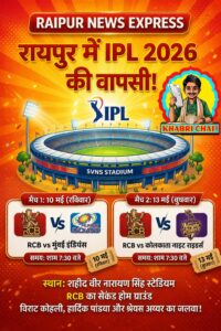 छत्तीसगढ़ के क्रिकेट प्रेमियों के लिए मई 2026 किसी त्योहार से कम नहीं होने वाला है। भारतीय क्रिकेट नियंत्रण बोर्ड (बीसीसीआई) ने पुष्टि की है कि रायपुर के शहीद वीर नारायण सिंह अंतरराष्ट्रीय स्टेडियम में आईपीएल 2026 के 2 बड़े मुकाबले खेले जाएंगे।