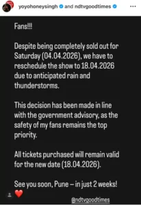 वहीं, इस बीच पुणे में 4 अप्रैल 2026 को प्रस्तावित हनी सिंह का लाइव शो फिलहाल स्थगित कर दिया गया है। आयोजकों के अनुसार, खराब मौसम के चलते कार्यक्रम को टालना पड़ा। अब यह कॉन्सर्ट 18 अप्रैल 2026 को आयोजित किया जाएगा। पहले से खरीदे गए टिकट नई तारीख के लिए मान्य रहेंगे।