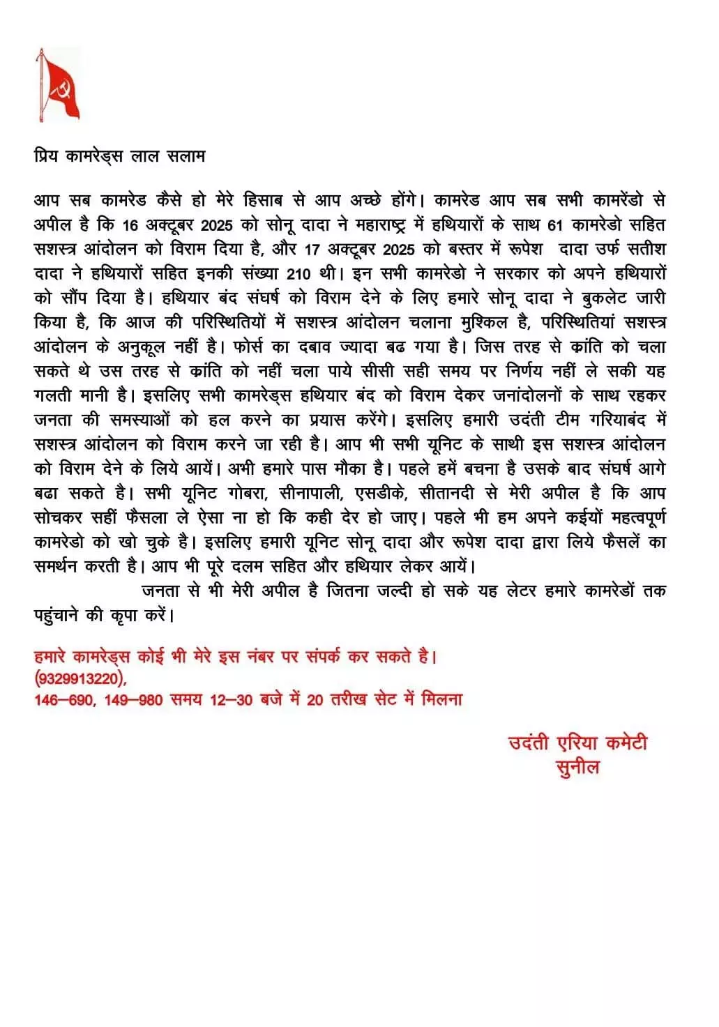गरियाबंद में नक्सली कमांडर सुनील ने आत्मसमर्पण की घोषणा की, 20 अक्टूबर को होगी चर्चा