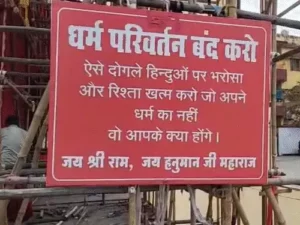 Khabri Chai Desk : नवरात्रि पर्व पर इस बार बिलासपुर में एक अलग माहौल देखने को मिल रहा है। शहर के दुर्गा पंडालों में बैनर लगाकर हिंदुओं को संदेश दिया जा रहा है कि “धर्म परिवर्तन बंद करो” और उन लोगों से सावधान रहें जो अपने धर्म से दोगले हैं। संदेश में यहां तक लिखा गया है कि जो अपने धर्म का नहीं हो सका, वह किसी का भी भरोसेमंद नहीं हो सकता।
